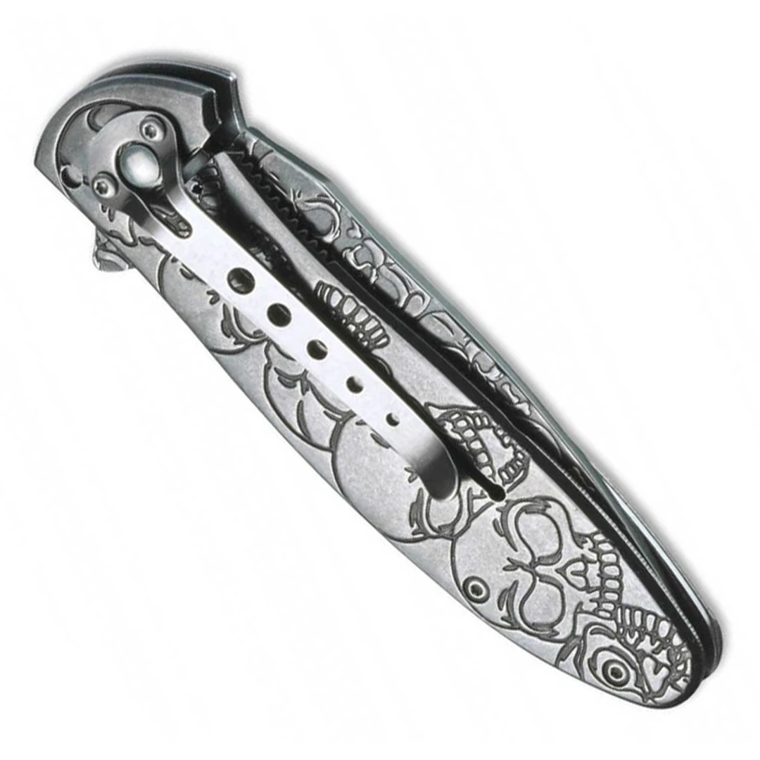 Boker Magnum Dia De Los Muertos Folding Knife is a unique knife that pulls design cues from the Day of the Dead. This knife has a handle made of stainless steel embellished with several skulls. The textured handle provides a great grip and great visual appeal. The 7Cr17Mov stainless steel blade is also embellished with skulls and bones, and can be opened using the spring assisted flipper mechanism.