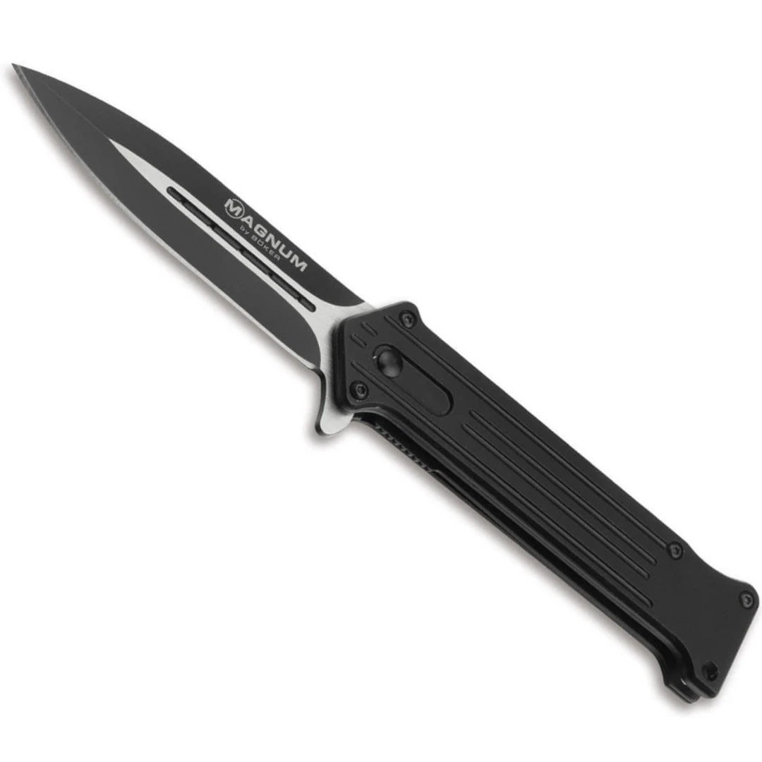Boker Magnum Intricate Compact Folder Knife is a reliable utility knife. The single-edged, spearpoint blade of this knife is made of tough 440A stainless steel which sports a striking two-tone finish. The handle of this knife is made of black aluminum over black steel liners, giving this knife an intimidating yet classy aesthetic. This tough knife is a great addition to any collection.