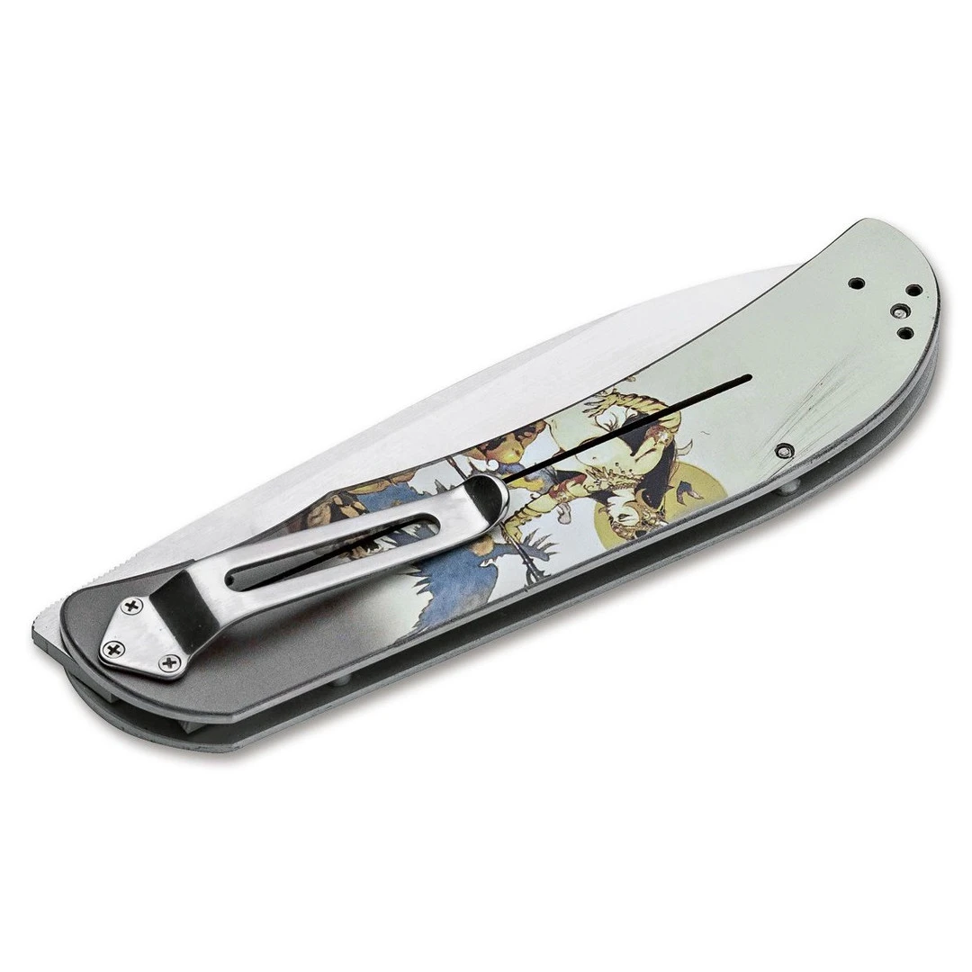 Frank Frazetta has been quickly making his mark on the new Boker knives this year proving once again that his artistry is certainly second to none! You can find Frazetta’s work in comic books, the movie industry and even music album covers. Mike Skellern, who stems from South Africa, brings his knowledge and expertise of the gentlemen’s style folder into this upgraded rendition of Boker’s most sough after family of folders. The Boker Plus line of knives are designed in cooperation with knife experts worldwide and provide innovative knife concepts for every task. This model features aluminum handle scales with Frank Frazetta’s “Ghoul Queen” piece, a drop point style blade in a satin finish and the reversible pocket clip is designed for both a tip up or tip down carry option on the traditional side of the handle.
